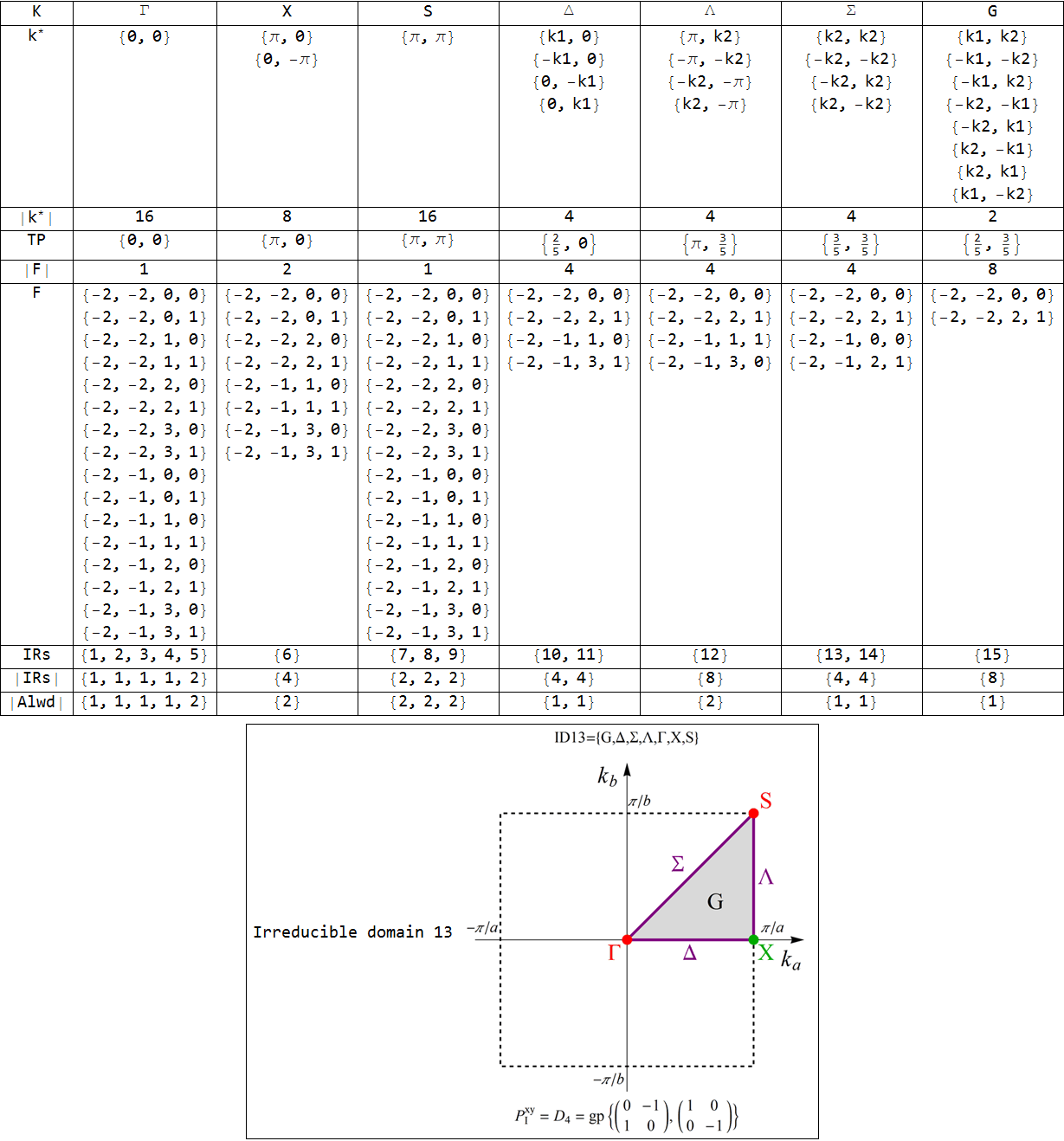 IRs - Ordinals of associated IRs, |IRs| - IRs' dimensions, |Alwd| - Allowed reprresetations' dimensions