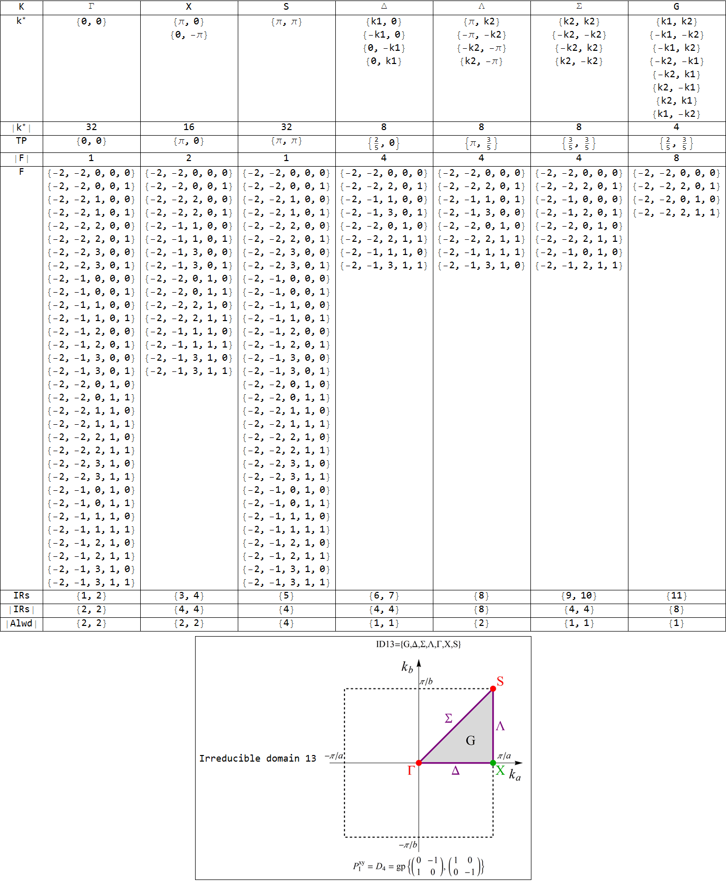 IRs - Ordinals of associated IRs, |IRs| - IRs' dimensions, |Alwd| - Allowed reprresetations' dimensions