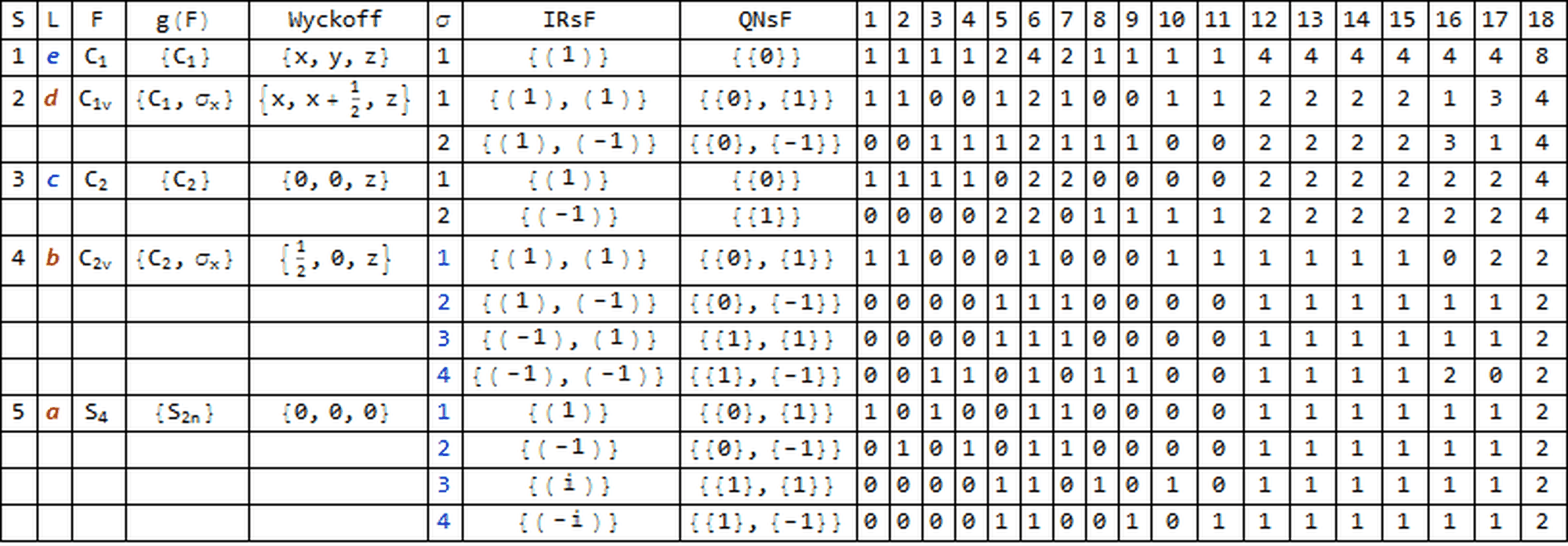 S - Stratum ordinal, L- Stratum label , F - Site symmetry, g(F) - stabilizer's generators, Wyckoff - general coordinates,